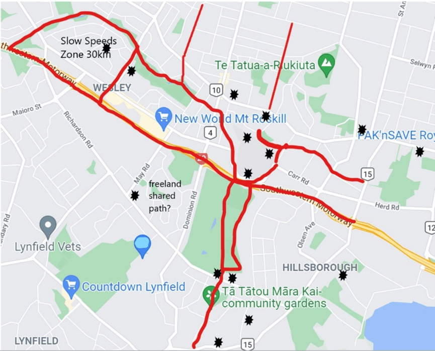 This project will span over three years and see the creation of cycle/scoot/walk trains to intermediate schools (at first) that are accessible on our Greenways network , in red on the map, with schools indicated with a star. It will also tie in with Kainga Ora’s redevelopment of the area, working with them to help new families in the area access a safe way to school. There will be events, wayfinding signage, safe bike storage and bikes. The board is paying 10% of the cost over three years, with the rest covered from the regional fund – an awesome return on our investment. It also sees benefits in a big drop in emissions, less cars at the school gate, increased health outcomes, more people using our facilities and an increased sense of community.